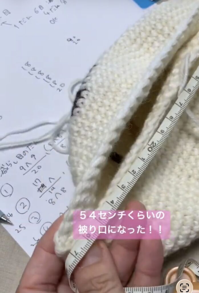 編み方表通りに編んで行ったらだいたい54センチの被り口になりました!